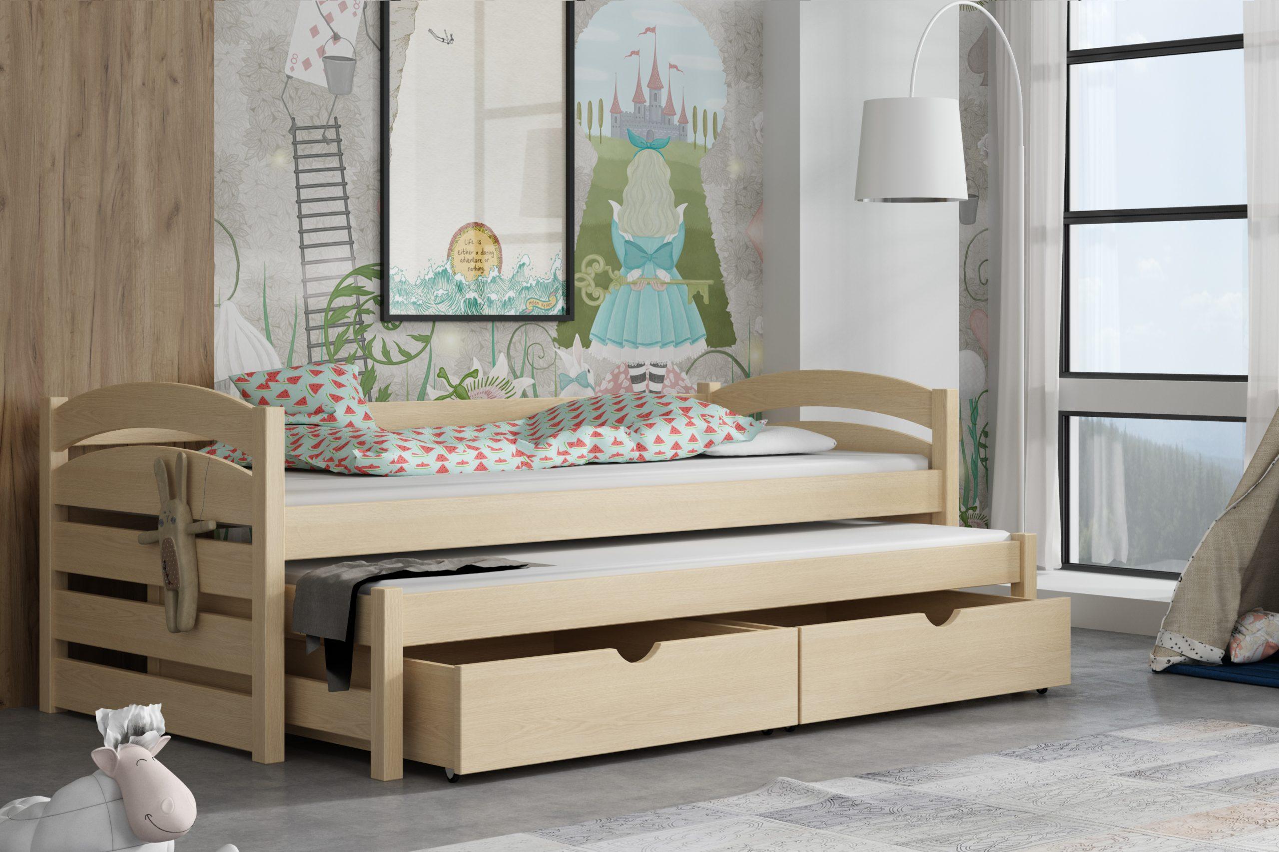 - Dřevěná postel s výsuvnou přistýlkou MONIKA 12 80x200 cm borovice masiv s úložným prostorem